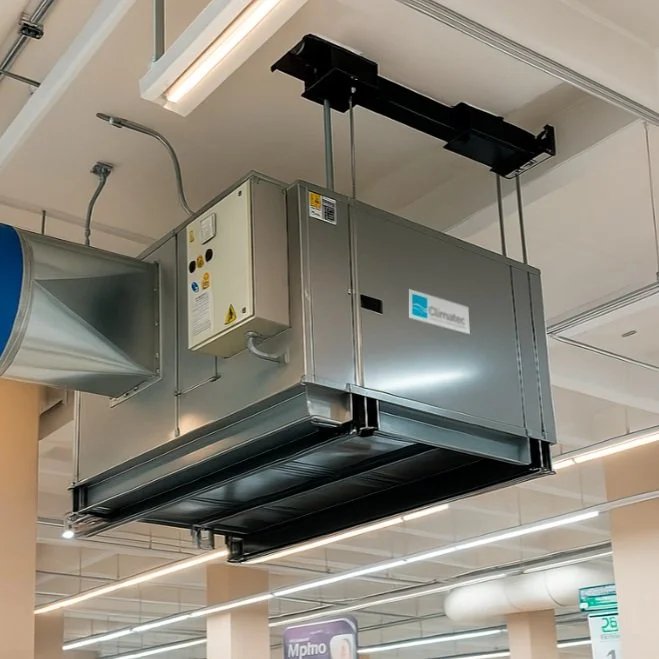En la imagen se observa una Unidad Manejadora de Aire (UMA) marca CLIMATEC, conectada a un sistema de refrigerante variable VRF, para instalación suspendida de la cubierta, instalada en el área de ventas de tienda de gran formato. Este sistema fabricado por CLIMATEC, representa una solución robusta, eficiente y económica para la climatización de grandes superficies comerciales.